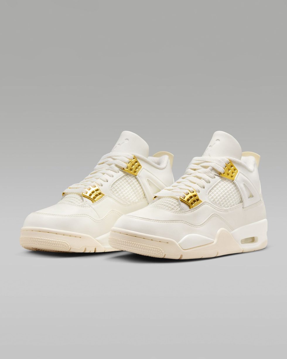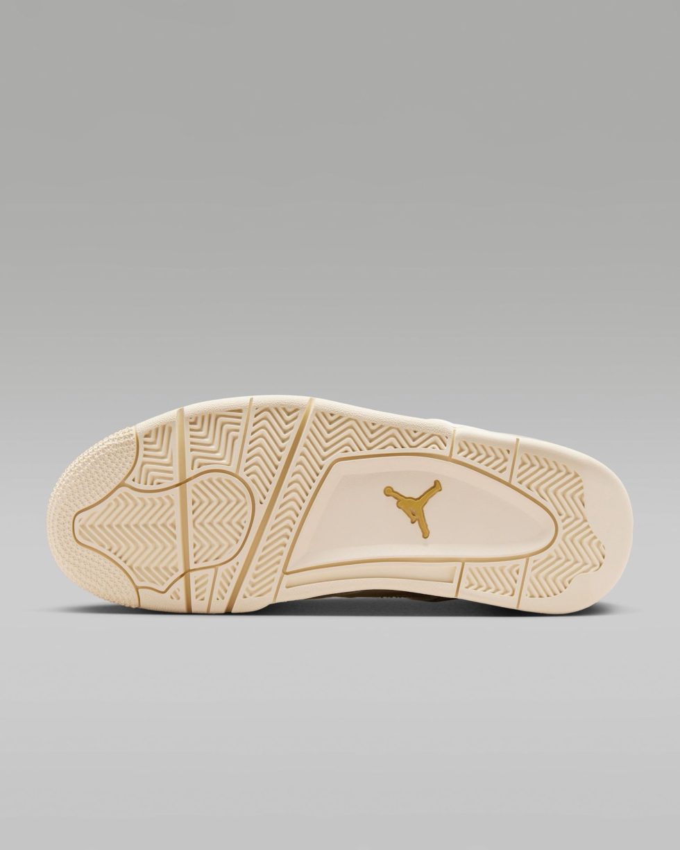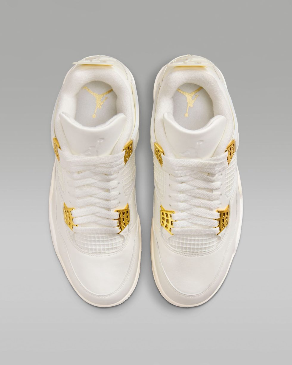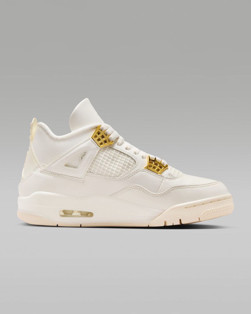✔️ Design iconic: siluetă clasică Jordan 4 cu aripi laterale, ochiuri metalice aurii și logo Jumpman strălucitor.